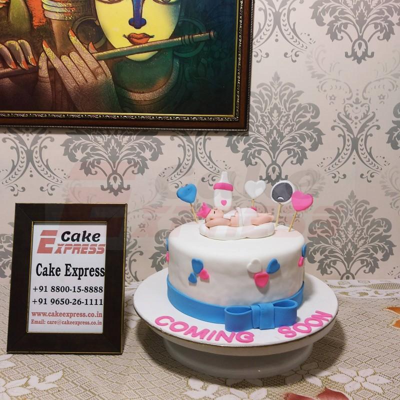 Introducing the Cute Baby Shower Fondant Cake from Theme Cake Store, the perfect centerpiece for celebrating the arrival of a precious little one. This adorable cake is designed to bring joy and delight to the baby shower event.